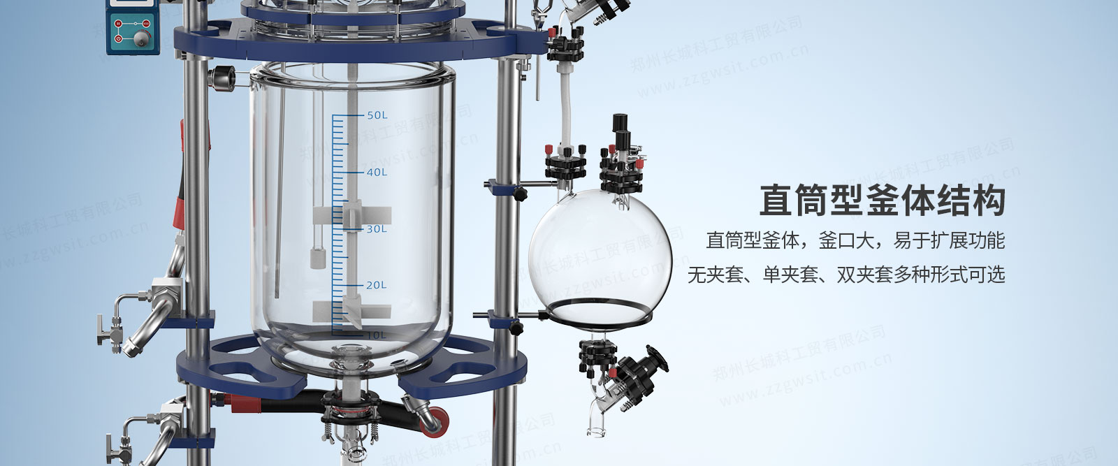 6、直筒型釜體結(jié)構(gòu):直筒型釜體,釜口大,擴(kuò)展功能多,無夾套、單價(jià)套、雙夾套多種形式可選;